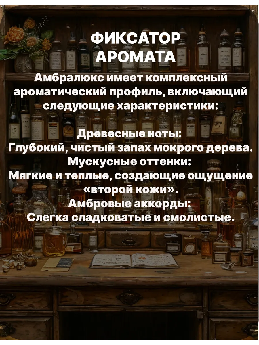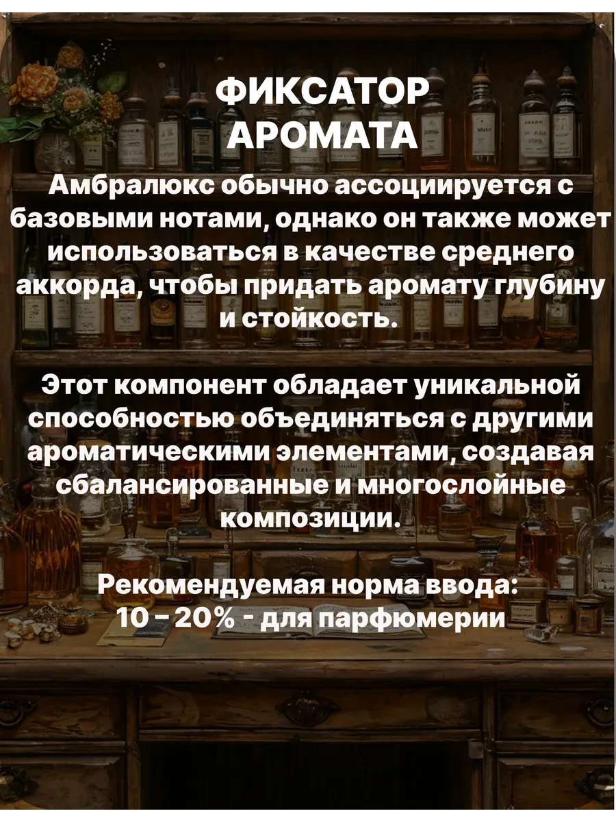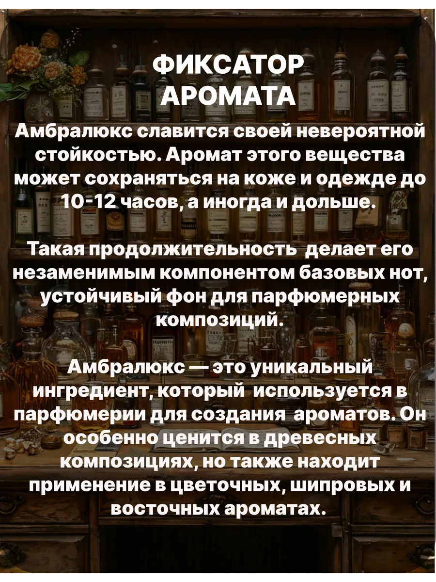 Амбралюкс – один из самых популярных компонентов благодаря своей способности придавать композициям объём и стойкость. Амбралюкс часто относится к базовым нотам, но может также использоваться и в средних нотах для придания глубины и стойкости аромату. Этот компонент обладает уникальной способностью сочетаться с другими ароматическими элементами, создавая гармоничные и многослойные композиции. Амбралюкс используется в парфюмерии для создания разнообразных ароматических композиций. Он особенно ценен в древесных композициях, однако также может быть использован и в цветочных, шипровых и восточных ароматах. Его универсальность и способность сочетаться с множеством других ароматов делают его популярным среди парфюмеров.