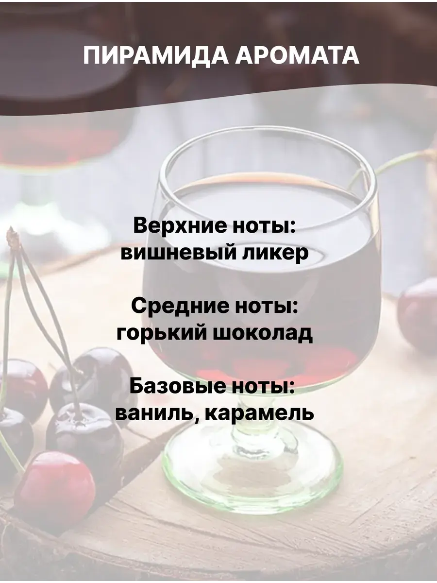 Отдушка «Вишня в коньяке» — это аромат‑искушение, благородная симфония сладости и глубины, где сочная ягода встречается с выдержанным алкоголем. Представьте себе элегантный бокал на бархатной скатерти: в нём — тёмные, налитые соком вишни, пропитанные янтарным коньяком, а воздух наполнен тёплыми, обволакивающими нотами ванили и древесины. Это не просто запах — это приглашение к изысканному удовольствию, упакованное в парфюмерную композицию.