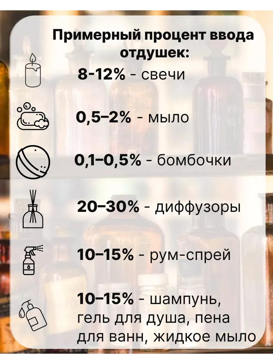 Отдушки для парфюмерии, для мыловарения, для бомбочек, свечей, для диффузоров в защищенном флаконе. Отдушка косметическая отлично подходят для изготовления косметики и других изделий своими руками. Данные парфюмерные отдушки подходят для изготовления свечей ручной работы из соевого воска, парафина или кокосового воска, парфюмерии и мыла.