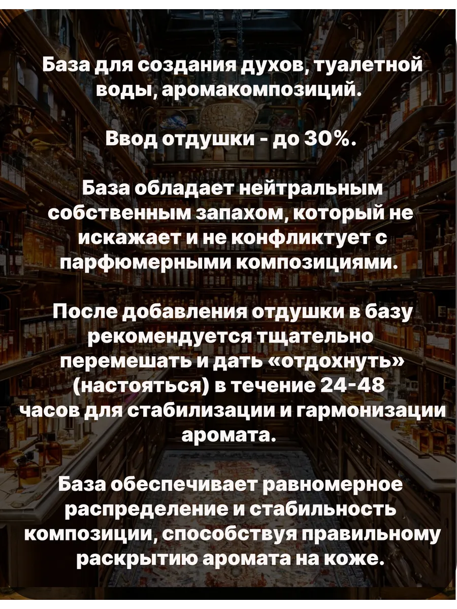 У неё нет ярко выраженного запаха, что идеально для любой отдушки. Основа быстро испаряется, не оставляя следов на коже и поверхностях. Она отлично сочетается с эфирными маслами и ароматизаторами, сохраняя стабильность формулы.